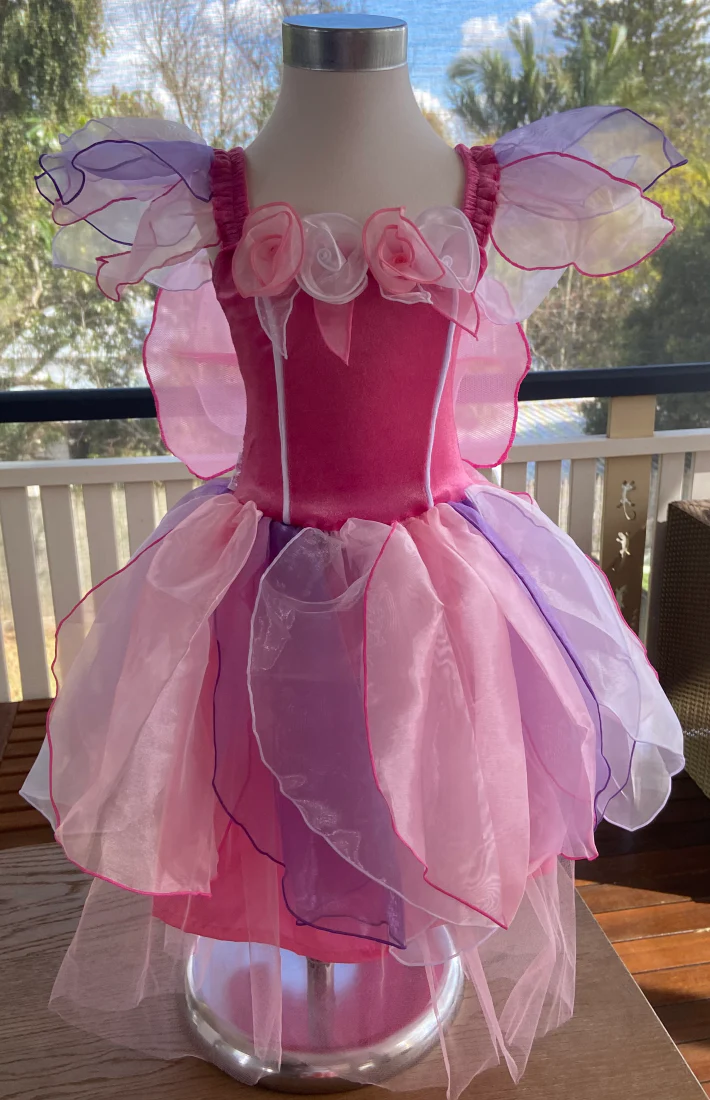 This beautiful sky fairy dress has a soft velvet bodice and an organza skirt with fairy wings attached. Candy Pink in Colour with purple and hot pink organza petal accents.Â