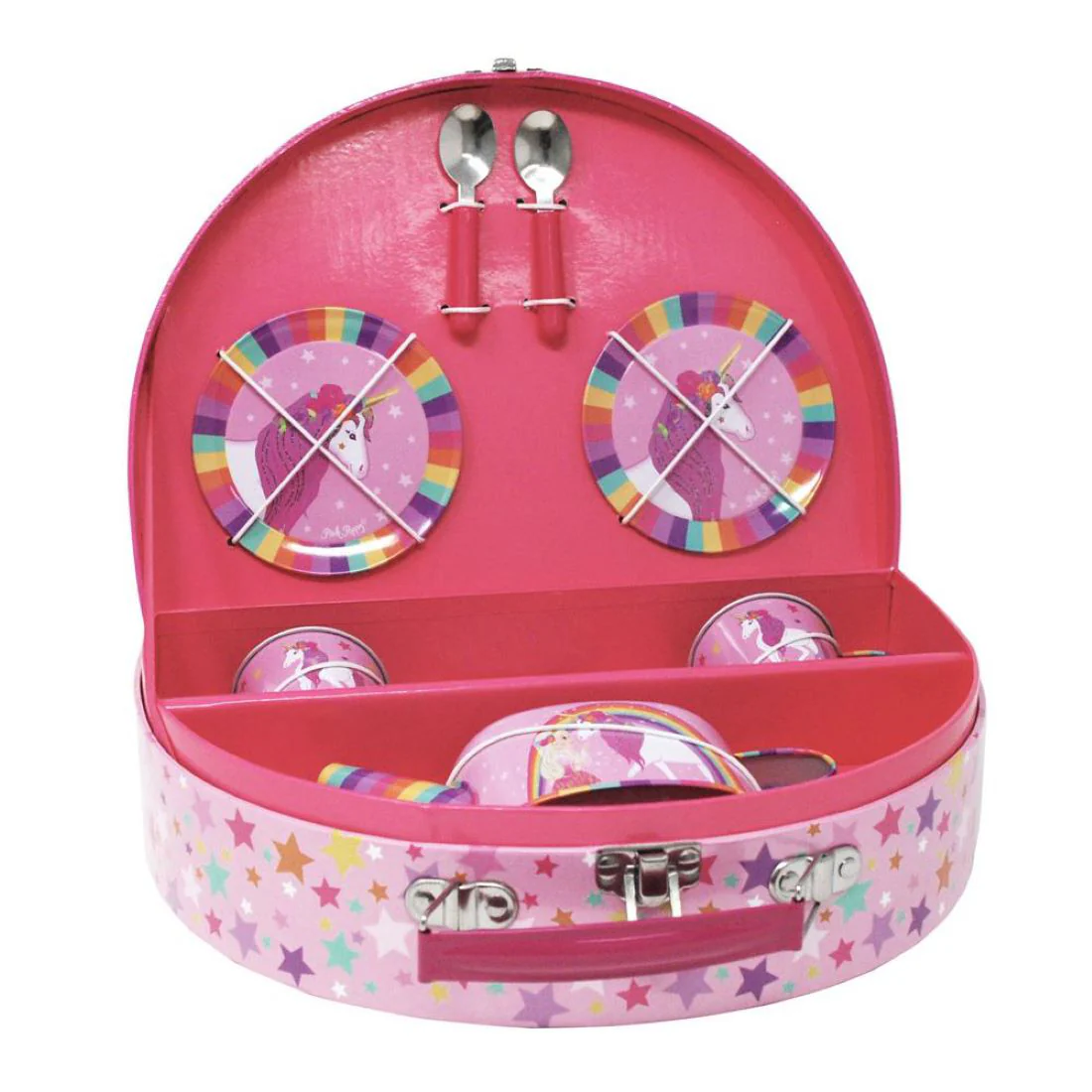 Invite your little one to host the most magical tea party with this charming Princess & the Unicorn tin tea set! Perfect for two guests, this delightful collection features a teapot with lid, matching cups, saucers, spoons, and plates—all crafted from durable, lightweight tin that won't break during playtime adventures. Everything packs neatly into a gorgeous coordinating carry case, making it wonderfully portable for tea parties anywhere. Spark endless imaginative fun with this enchanting set that's built to last through countless royal celebrations!